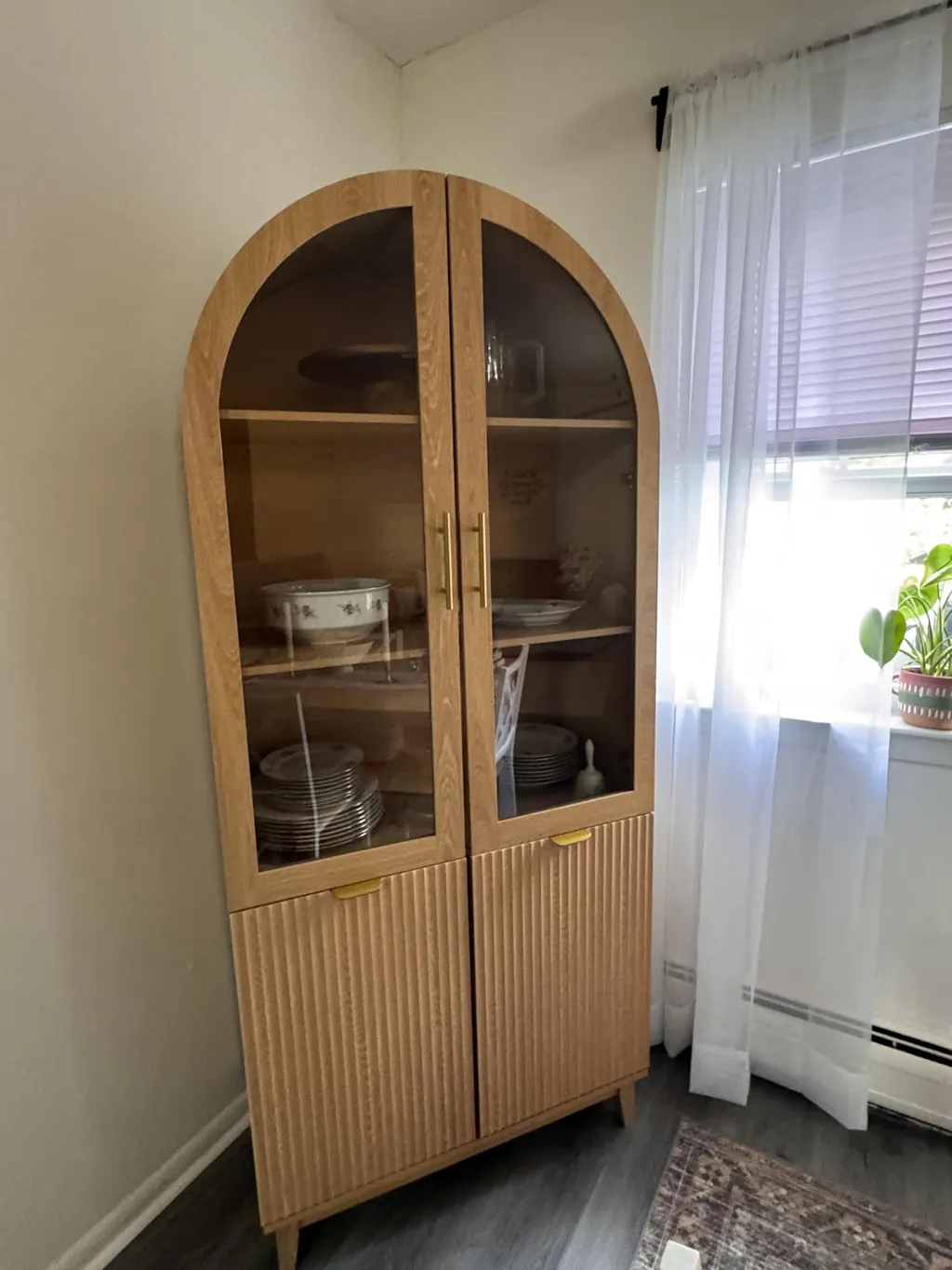The cabinet features a distinctive arched design at the top, which gives it a modern yet farmhouse feel.