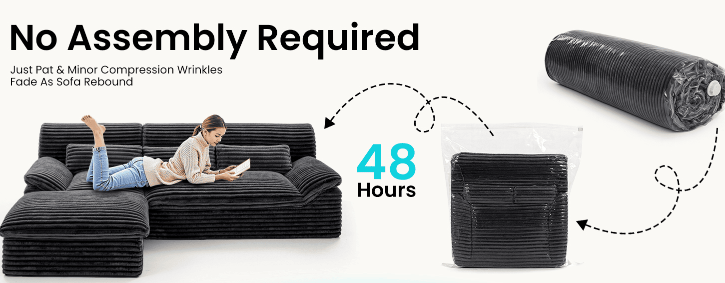 It takes 48 hours to fully rebound to its fluffy original shape. Users should unbox the vacuum-sealed package, gently pat the sofa to boost elasticity, and let it sit. Minor compression wrinkles will fade as the sofa rebounds.