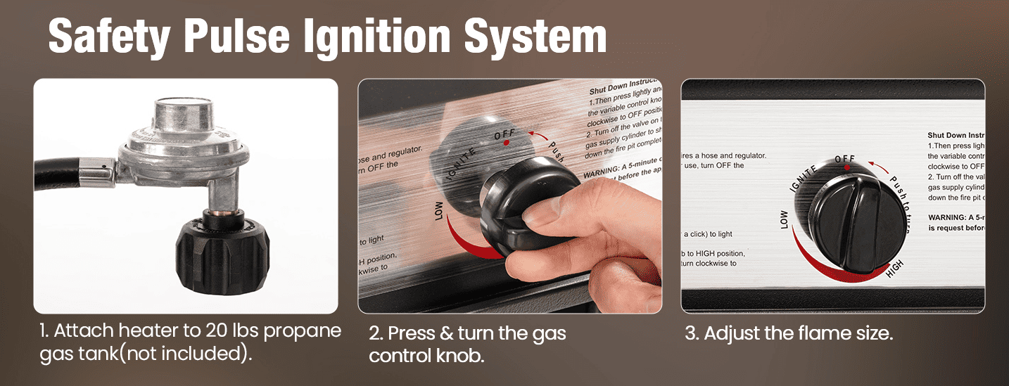 Press-button ignition starts flames in seconds (propane tank not included). If tipped, the heater cuts fuel instantly. Adjust the knob for low ambiance flames or high heat during chilly nights.