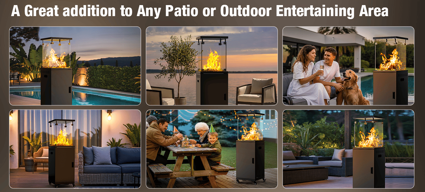 Two lockable casters and two swivel wheels glide smoothly across decks or uneven grass. Leveling feet stabilize the heater on slopes, and the 53” height ensures heat reaches seated guests without towering over conversations.