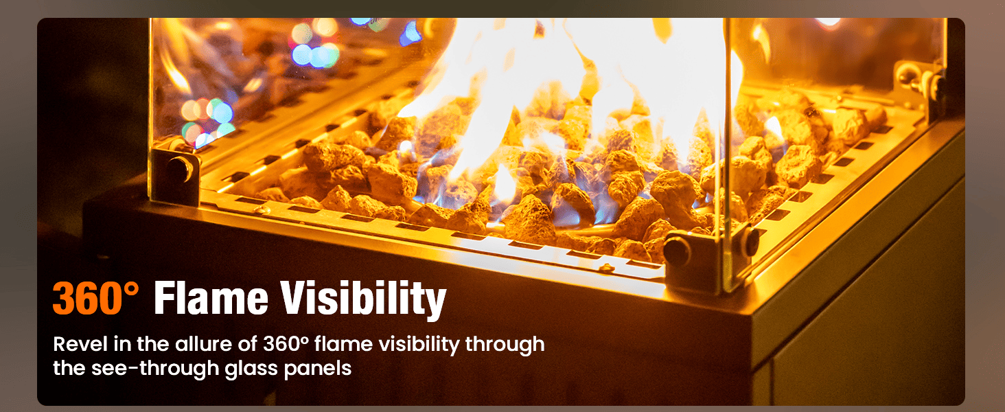 This heater is built with durable, high-quality materials, including a stainless steel burner and premium stainless steel body that resists rust and fading. The flames are enclosed in tempered glass, which not only adds to the elegant look but also provides a protective barrier. A dust cover is also included to protect the heater when it's not in use.
