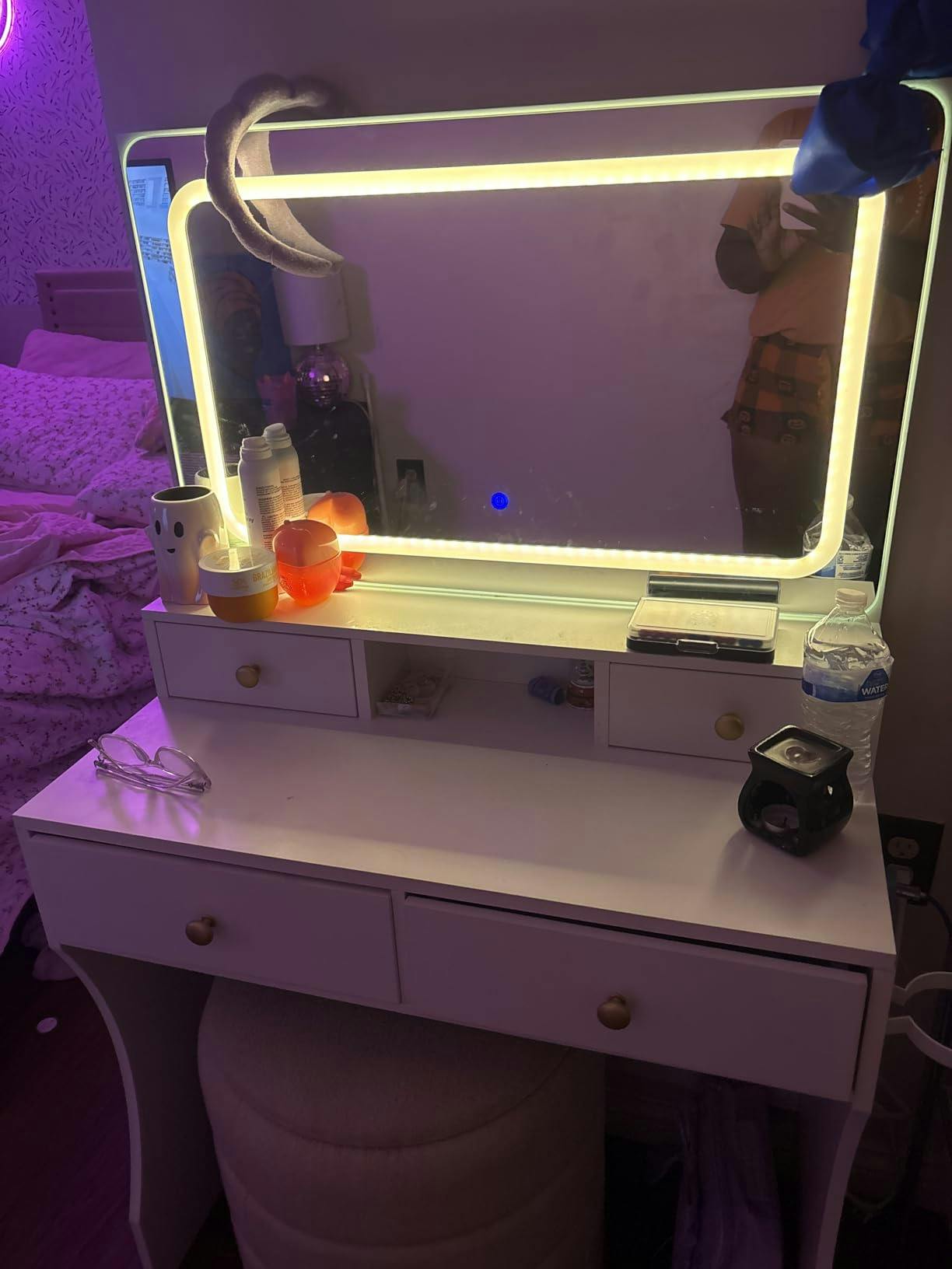 Golden accents against a white MDF frame deliver high-end aesthetics in a 38.8” footprint. Integrated hairdryer holder + AC outlet keeps styling tools accessible yet discreet. Storage stool (15.7”H) tucks neatly under the desk when not in use.