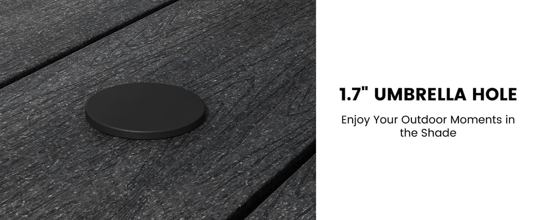 Premium HDPE materials ensure durability, and high-quality aluminum slats and 304 stainless steel screws boasts a stable. The 1.7" umbrella hole allows you to add shade during sunny days. A lifelike wood grain texture is easy to clean and maintain, making it an ideal choice for any outdoor decor.