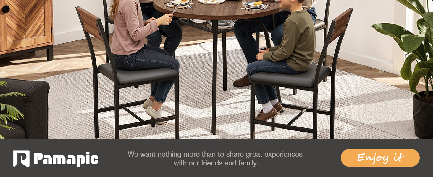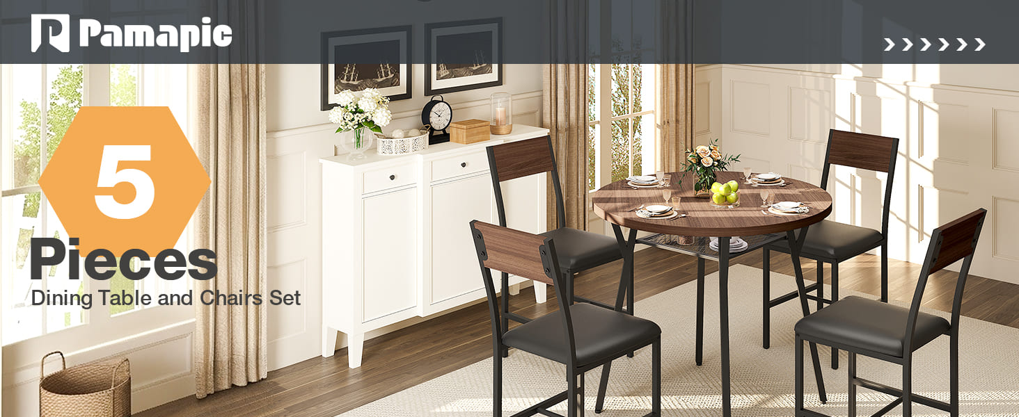 Pamapic Modern Round Dining Table Set for 4 with Meta Frame, Walnut