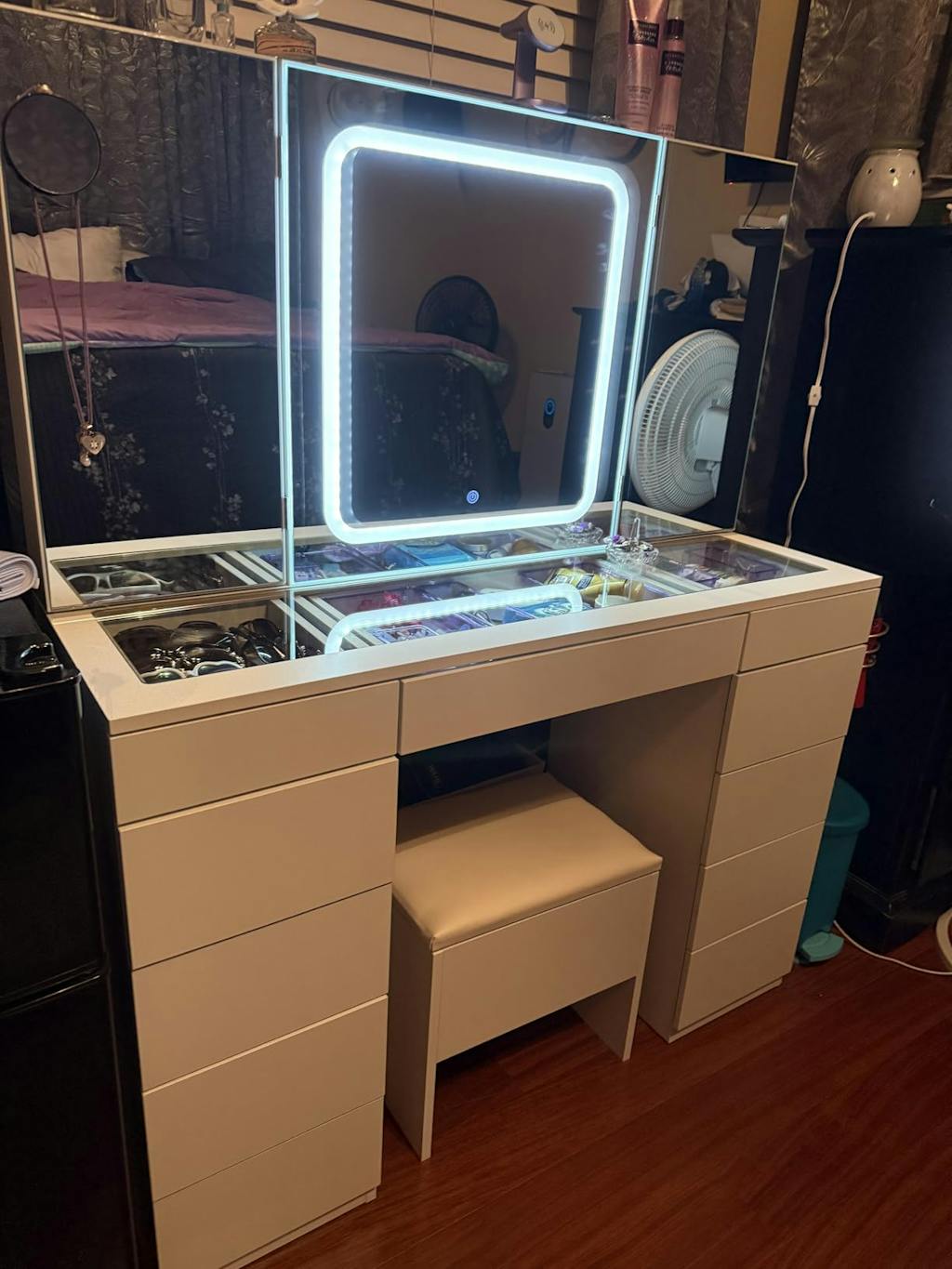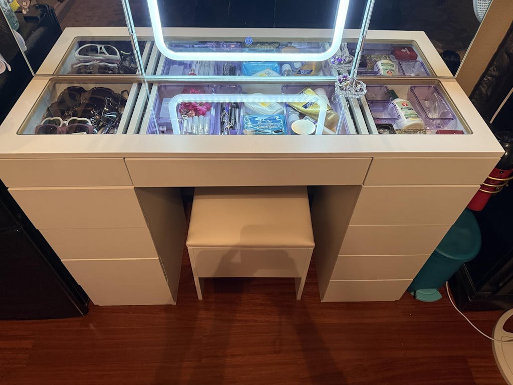 Large Storage & Glass Top: With 11 drawers, a clear glass top, and hidden stool storage, there is sufficient space to make everything stay organized and easy to find.