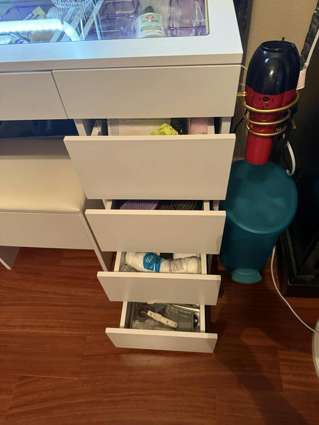 Modern Elegant Design: This vanity set includes 11 drawers, a glass tabletop, a metal hairdryer holder, and a foldable mirror—perfect for organizing beauty essentials in a chic, functional way.