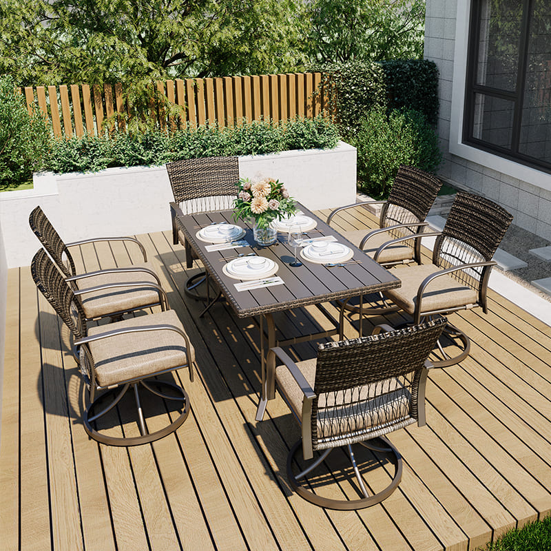 Designed for lasting comfort, this iron-framed rattan ensemble features six 360° swivel chairs with plush removable cushions and a dirt-resistant table with umbrella compatibility. Built to withstand sun, rain, and poolside splashes while maintaining elegant beige aesthetics.