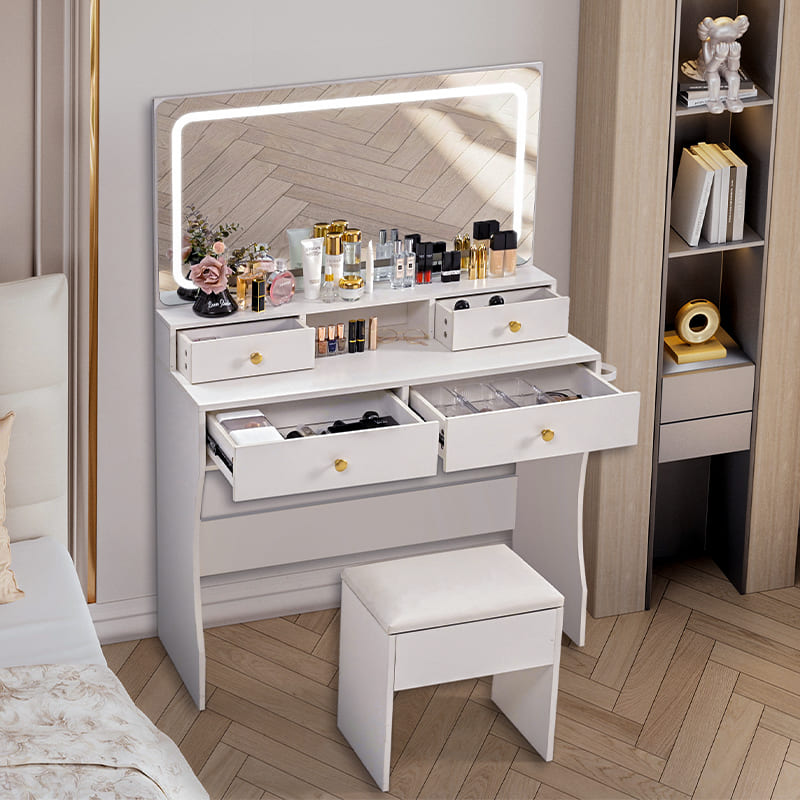 Golden accents against a white MDF frame deliver high-end aesthetics in a 38.8” footprint. Integrated hairdryer holder + AC outlet keeps styling tools accessible yet discreet. Storage stool (15.7”H) tucks neatly under the desk when not in use.
