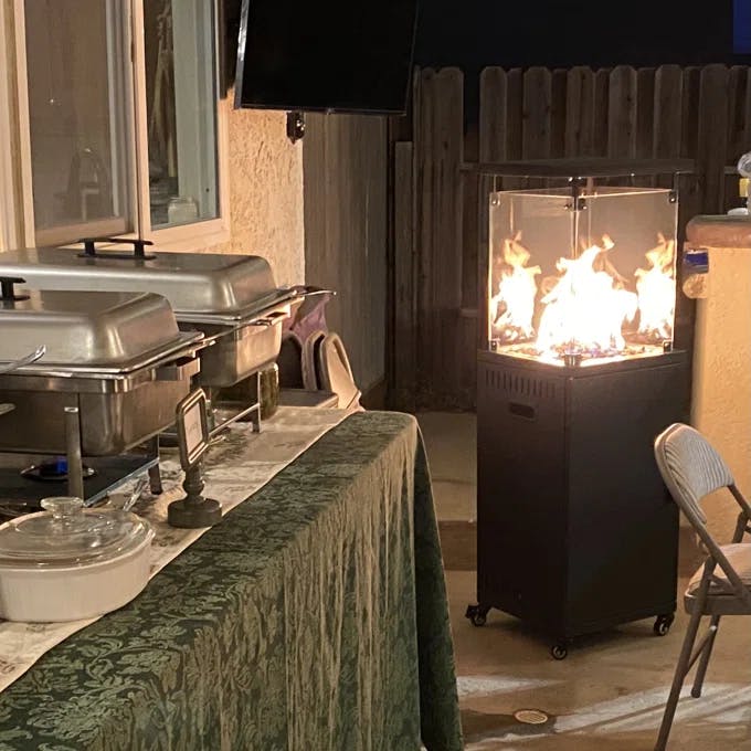 This heater is built with durable, high-quality materials, including a stainless steel burner and premium stainless steel body that resists rust and fading. The flames are enclosed in tempered glass, which not only adds to the elegant look but also provides a protective barrier. A dust cover is also included to protect the heater when it's not in use.