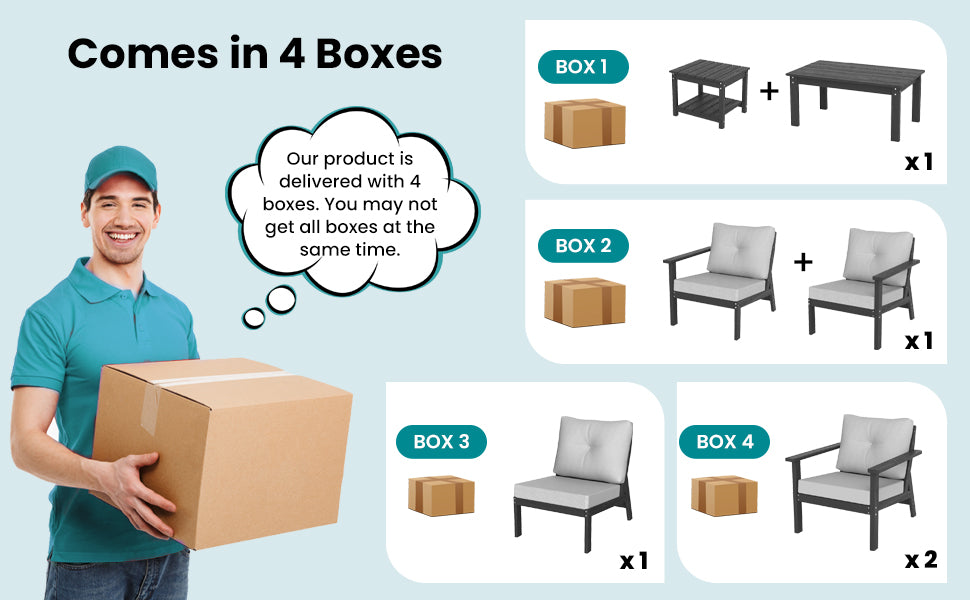 Easy Assembly: The outdoor patio furniture set arrives in 3 boxes, complete with an instruction manual and tools for hassle-free assembly. For optimal results, tighten all screws only after complete installation to prevent misalignment.